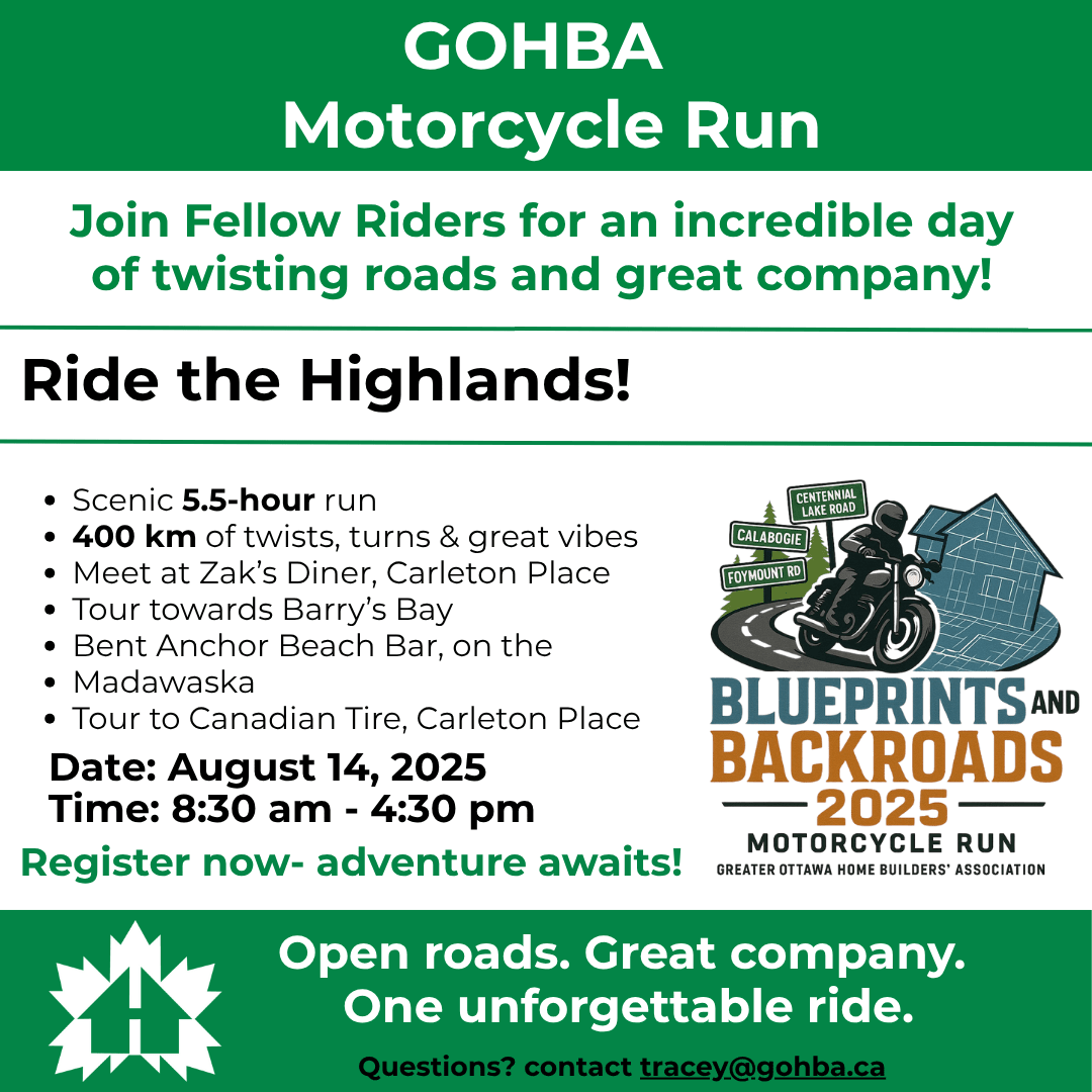 The Greater Ottawa Home Builders’ Association (GOHBA) assumes no responsibility or liability for any loss, damage, injury, or accident that may occur before, during, or after the event. By registering for this event, you confirm that you have read, understood, and agreed to the above waiver and release GOHBA, its organizers, volunteers, and affiliates from any and all claims or liabilities.