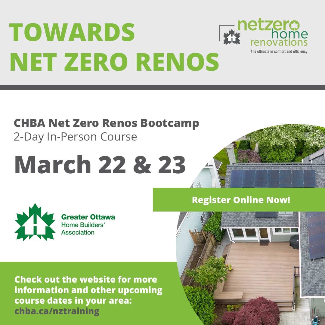 The Towards Cost-Effective Net Zero Energy Ready Residential Renovations project is looking to build capacity throughout the home building construction industry to respond to demand for Net Zero and Net Zero Ready renovations. The scope of existing buildings is not only expansive but an increasing focal point for energy and emission reductions. This Net Zero Renos Bootcamp offers a highly intensive Net Zero training. It will build on the foundation of prerequisite house-as-a-system and advanced building science training, and provides the full CHBA Net Zero Builder and CHBA Net Zero Renovator qualification curriculum in 2 packed days! In addition, the course includes an introduction and application module on use of the Integrated Design Process in a Part 9 renovation setting. Case studies and local builder panel discussions will engage on best practices that will help to prepare participants in the Towards Net Zero Renos project and to build your business in this growing field.